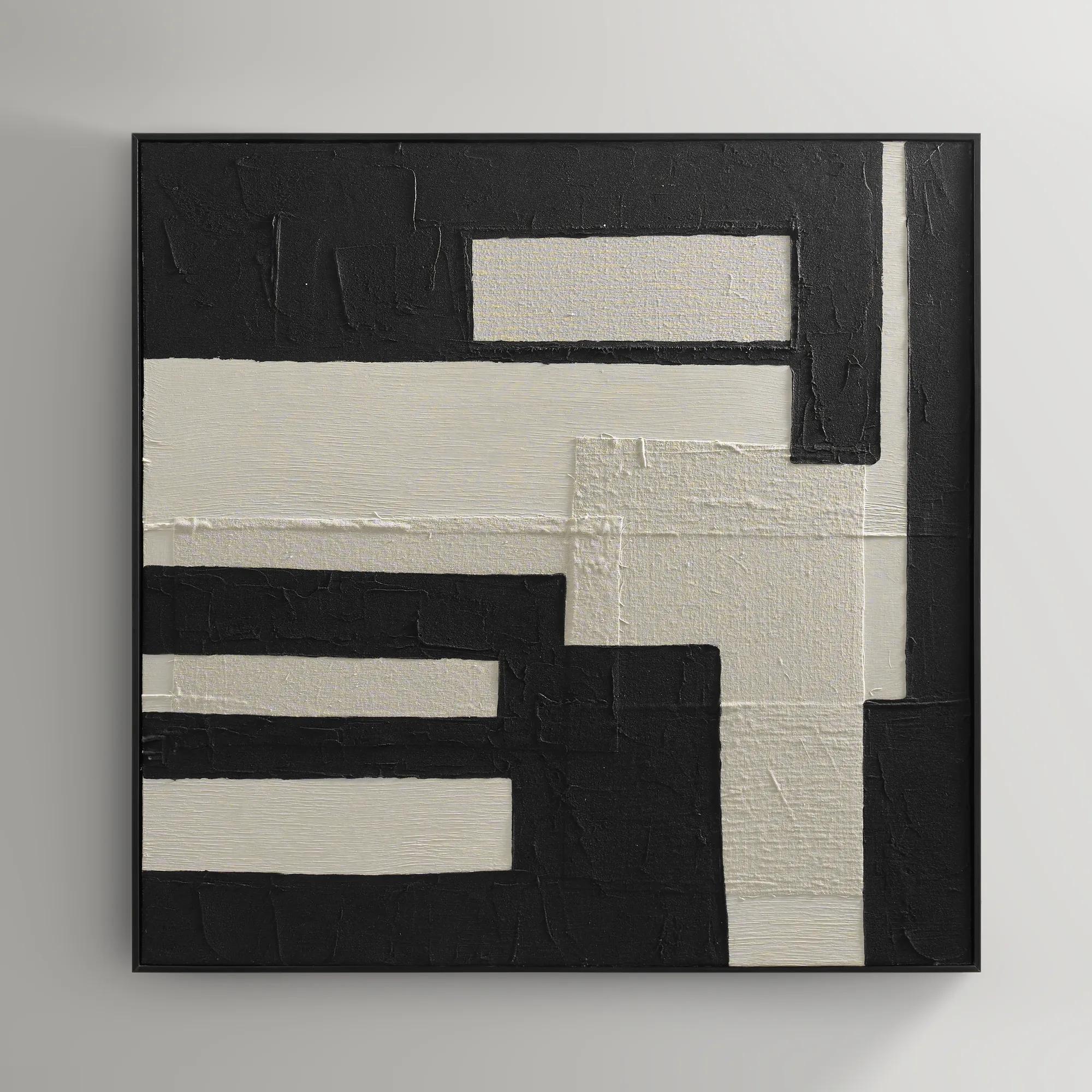 Collage Painting 1 juxtaposes bold black and white tones for a striking visual impact. Geometric shapes and layered textures create a dynamic composition that evokes modern architectural precision. Framed in a sleek black floater frame, it’s perfect for a contemporary aest.DETAILS AND DIMENSIONSHand-painted canvas set in a black floater frameBlack/white39.4"W x 1.8"D x 39.4"HImported