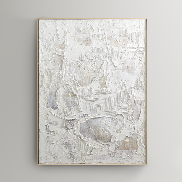 A serene exploration of texture and tone, the Stone Heritage Painting captures subtle contrasts in a mesmerizing dance of light and shadow. The textured white surface evokes depth and dimension, inviting the viewer to linger over its intricate details. Encased in a warm beech wood floater frame, this artwork adds a touch of understated sophistication to any space.DETAILS AND DIMENSIONSHand-painted canvas set in a beech wood finish floater frame.White47.2"W x 1.8"D x 35.4"HImported
