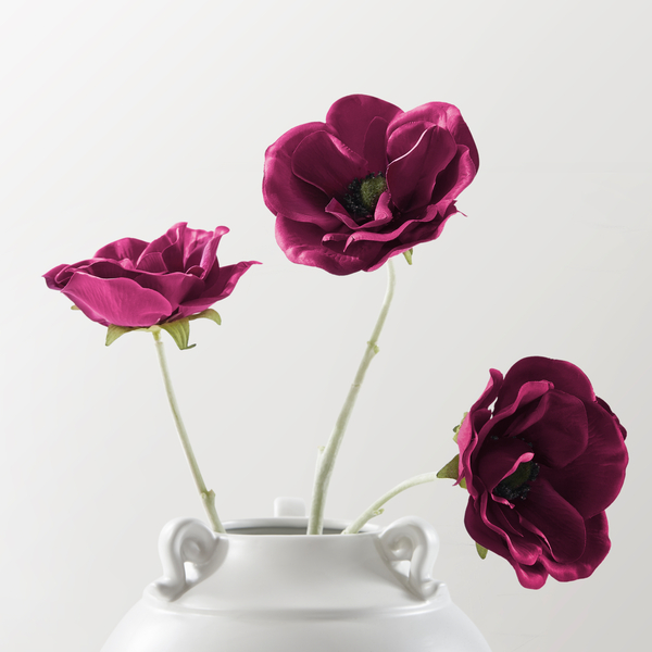 Add a romantic touch to your decor with these berry-hued Anemone stems. Their soft tones and realistic design bring timeless beauty to any arrangement.DETAILS AND DIMENSIONSFaux - PolysterBerry RedSet of 321"HImported