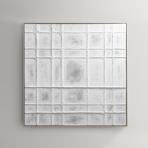 Aster Painting marries subtlety with structure in an engaging abstract composition. Delicate white tones interplay with shadow to evoke a serene yet textured effect, enhanced by a geometric grid pattern. Framed in a warm whitewash finish floater frame, this piece offers understated elegance to any decor.DETAILS AND DIMENSIONSHand-painted canvas set in a white wash finish floater frame.White47.2"W x 1.8"D x 47.2"HImported