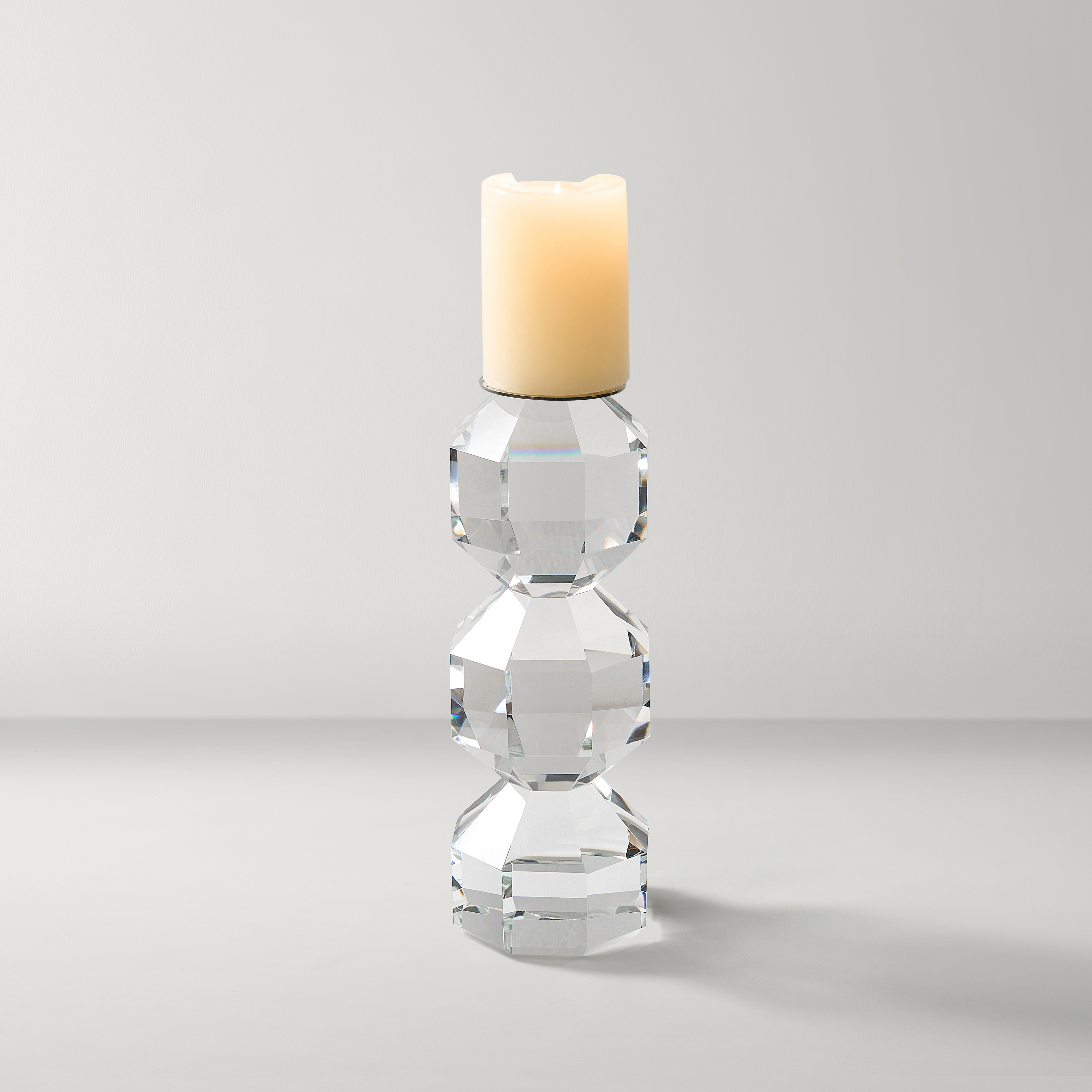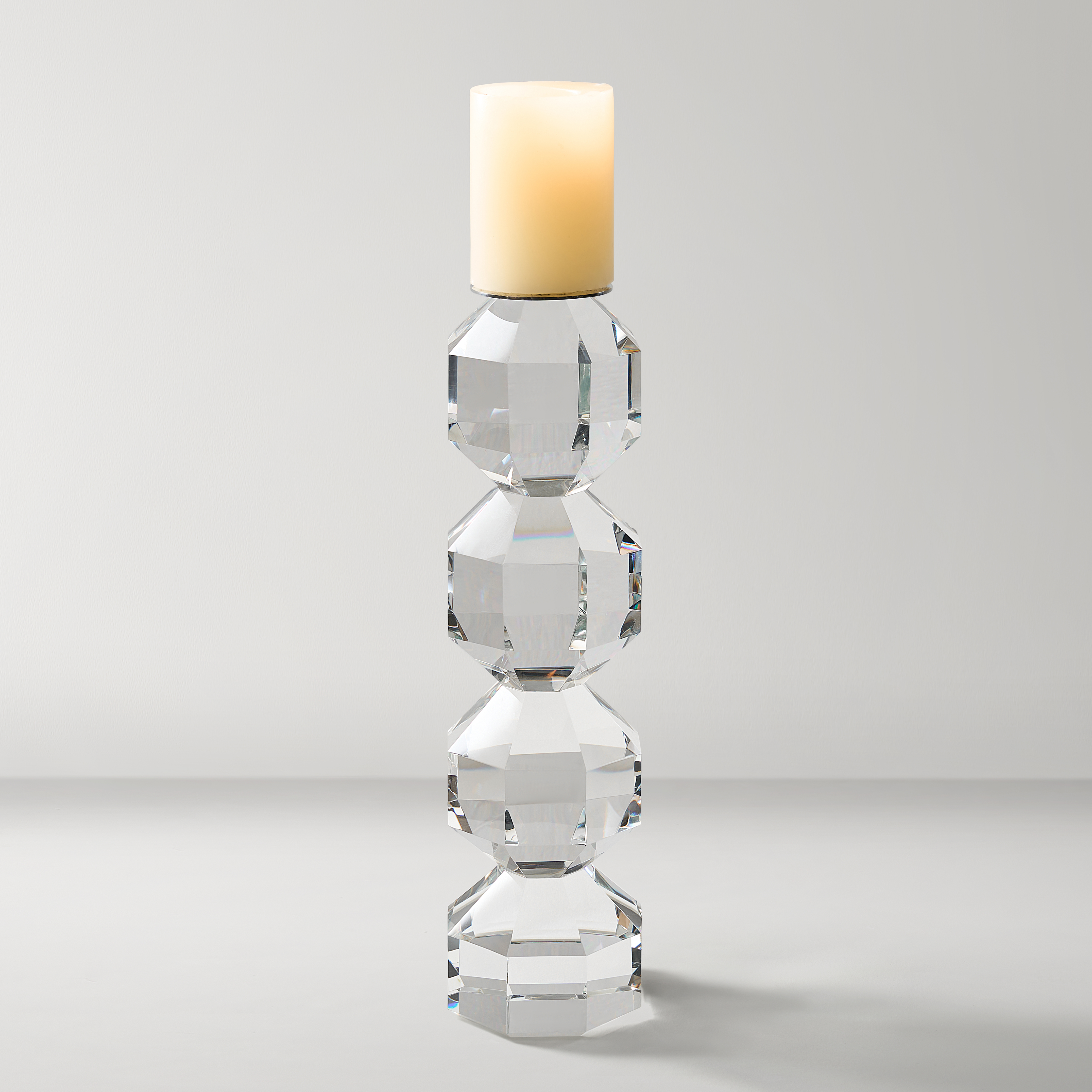 The Chiaro Crystal Pillar Holder is a dazzling blend of geometry and elegance. Its faceted glass silhouette plays with light and shadow, bringing a refined sparkle to any mantel or side table.DETAILS AND DIMENSIONSCrystal Glass/IronClearSold separatelySmall: 3.9" Diameter x 12"HLarge: 3.9" Diameter x 16.3"HImported