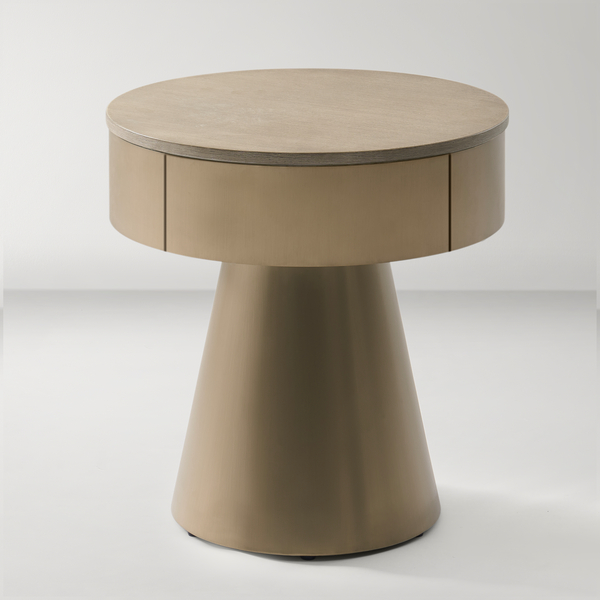 The Flare End Table in Sea Drift finish brings an air of refinement to your home. Its crescent-shaped natural white marble top rests on a gleaming gold-plated stainless steel base, creating a balance of beauty and functionality. The soft-close drawer ensures convenient storage while maintaining its clean, timeless look.ZG ExclusiveDETAILS AND DIMENSIONSNatural veneer table top with wirebrushed wood tone finish.Base with anti finger print finish (Easy to remove finger prints)Storage drawer with concealed finger pull.Looks great to match with accent chair, or use as nightstandOak veneer top, brushed stainless steel baseColour: Sea DriftSoft close drawerWire brushed top and edgesFrame Material: Stainless steelDia 20" x 21"HSold separatelyImportedOTHER INFOFor indoor use onlyNatural veneer will be impacted by heat and humidity fluctuations and may result in bubble. Protect your furniture by avoiding direct contact with air conditioning units or heating vents.Keep dryTo prevent oxygenization, please don't place this product in high moisture space or wet floorEasy assembly within 30 minutes