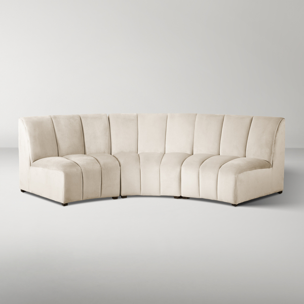 Comfort can be classy and stylish, and Jayce is proof. With its curved, armless silhouette and deep channel-tufted upholstery filled with plush padding, this sectional brings modern style and luxurious comfort to the living room. Shown in Velvet Ivory.Z Gallerie ExclusiveDETAILS AND DIMENSIONSKiln-dried hardwood and hardwood-ply frame is corner-blocked for stability and strength.Sinuous springs are designed to distribute weight evenly, ensuring long-lasting comfort and durability.Seat and back cushions feature a high-density foam core wrapped in a polyester fill for a more structured look.Our ultra-soft Velvet fabric is 100% polyester performance fabric. It is water repellent and stain-resistant fabric allows for easy cleaning.Chair can be used individually or pair with multiple to create a larger seating arrangement.Concealed connectors prevent sectional pieces from shifting.Espresso finished feet feature glides to prevent scratching floor surfaces.ImportedDimensions: 82"W x 40"D x 33"H Seat Height: 17"H Seat Depth: 24"DOTHER INFORotate cushions and vacuum frequently to remove dust and prevent general soiling.To prevent fading, keep fabric out of direct sunlight.Blot spills immediately.Spot clean with a damp white clothDo not saturateAir DryFor overall cleaning, consult with a professional upholstery cleanerFor indoor use only.