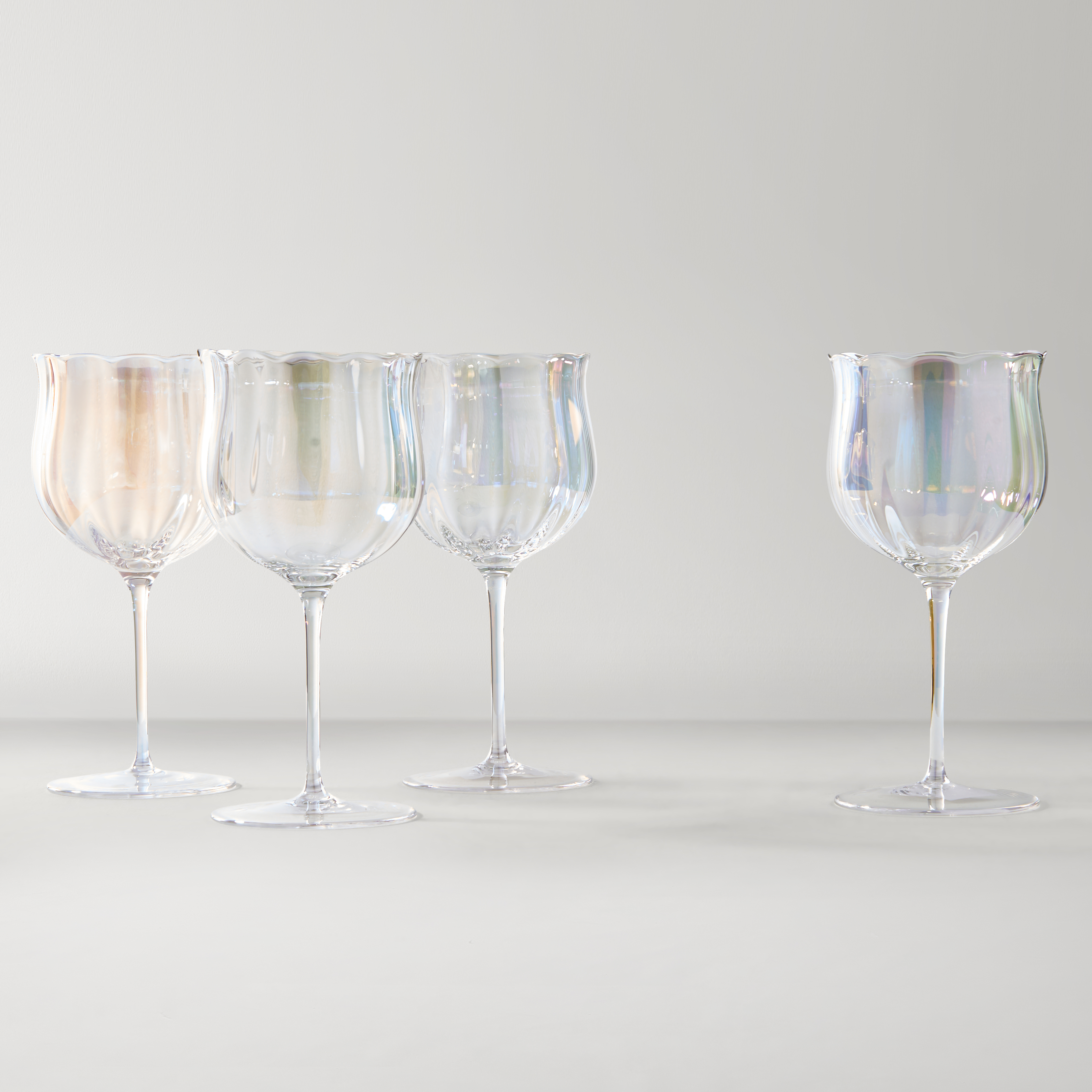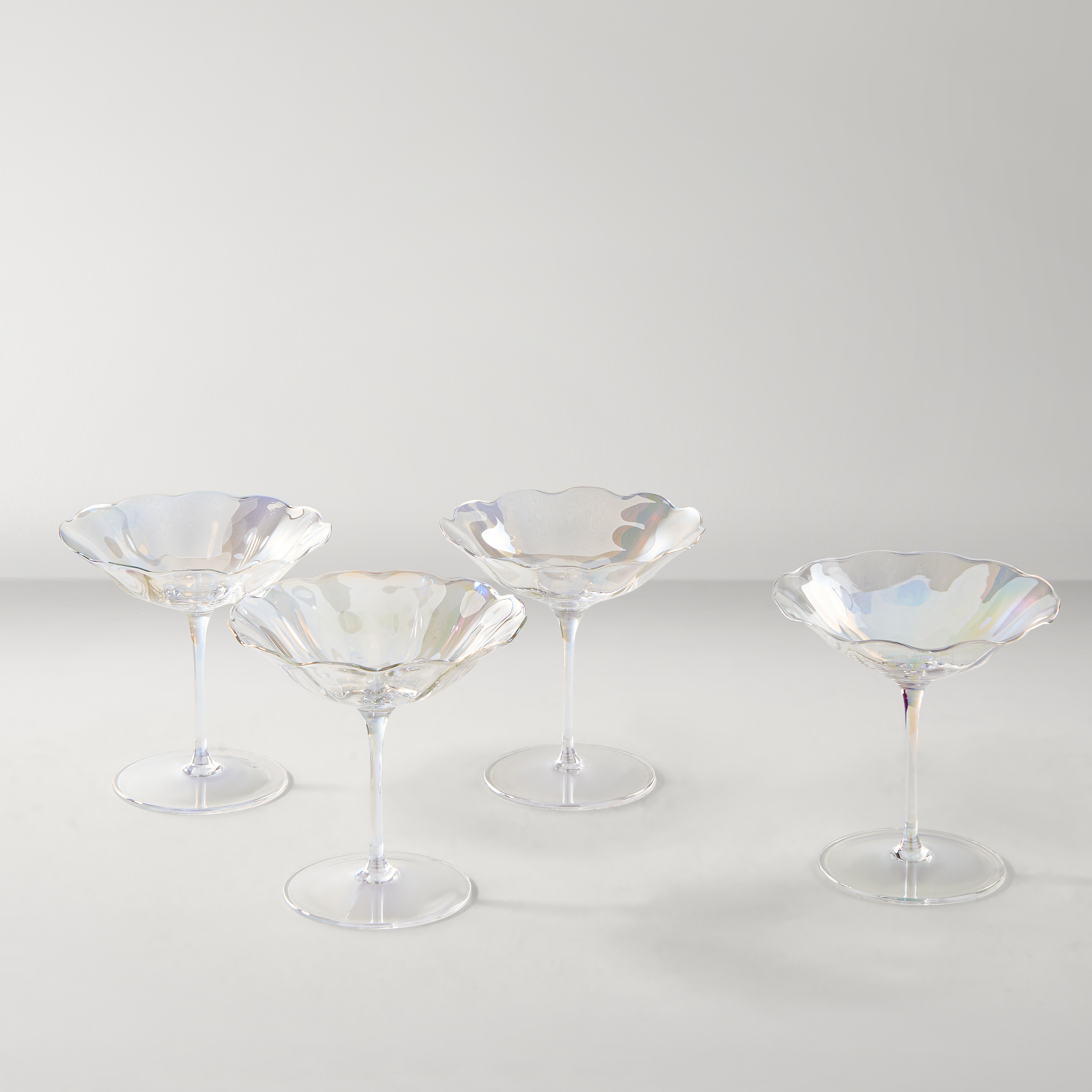 Elevate your cocktail hour with the Kerisma Glassware Collection. Featuring an iridescent finish and delicate scalloped edges, these versatile glasses bring glamour to any table. Whether you’re hosting a soirée or enjoying a quiet evening, they offer the perfect blend of style and sophistication.DETAILS AND DIMENSIONSSoda LimeKerisma Flute - Set of 4: 2.4" Diameter x 8.7"H, 3.4 ozKerisma Coupe - Set of 4: 3.4" Diameter x 5.9"H, 4.9 ozKerisma Martini Glass - Set of 4: 4.9" Diameter x 4.9"H, 4.9 ozKerisma Wine Glass - Set of 4: 3.6" Diameter x7.5"H, 15.2 ozSold in sets of 4ImportedOTHER INFOHand wash only