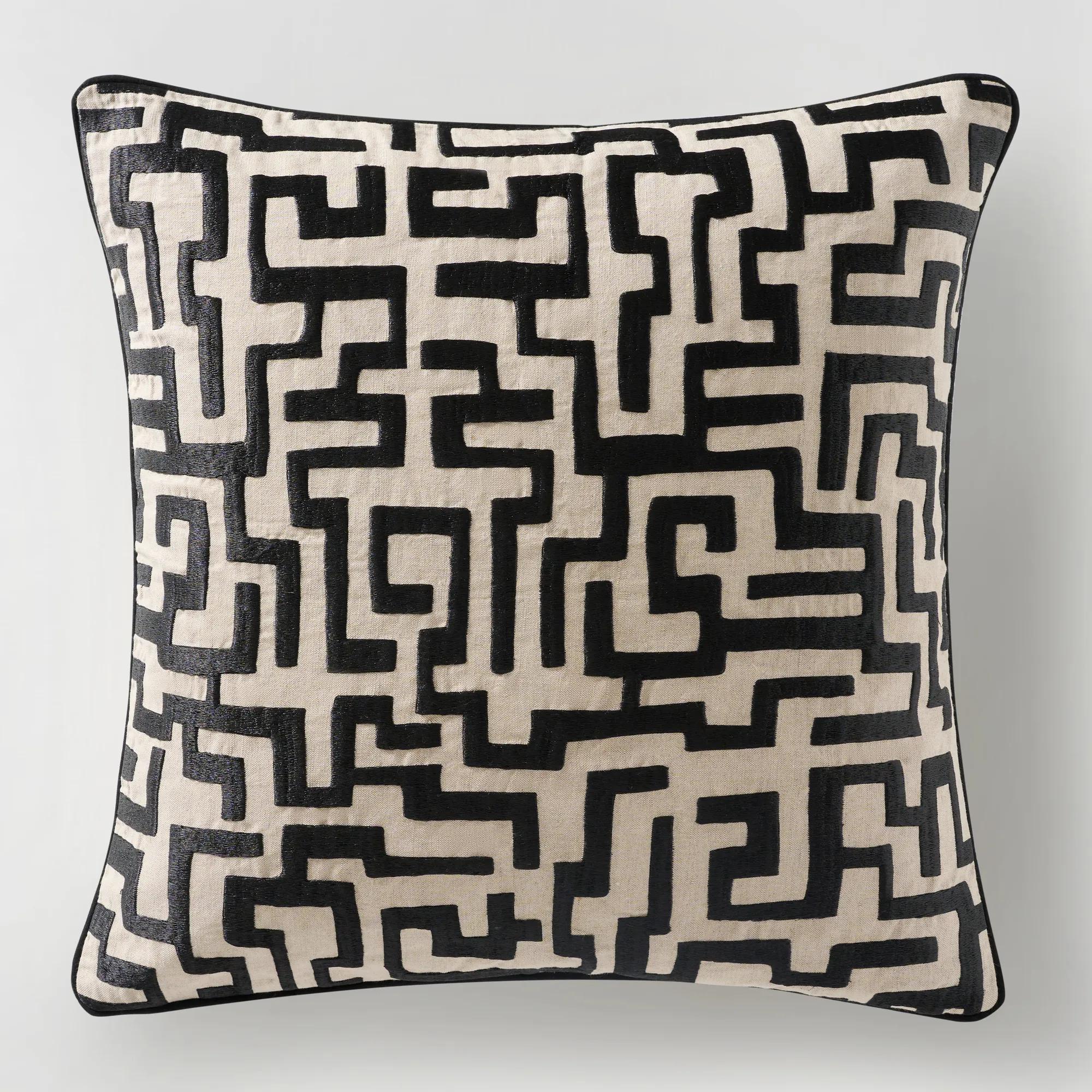 Add a touch of contemporary style to your space with the Mod Maze Pillow. Its geometric print introduces a modern flair, beautifully complemented by a metallic black embroidered pattern and coordinating luxurious black metallic piping edge. Removable insert is included.Z Gallerie exclusive.DETAILS AND DIMENSIONSFront and Back: 50% Cotton/50% LinenFront is embroidered with black metallic threadBack: SolidPiped edge detailRemovable Insert: 95% Feather/5% Down (included)Hidden zipper closure22" x 22"ImportedOTHER INFOSpot Clean