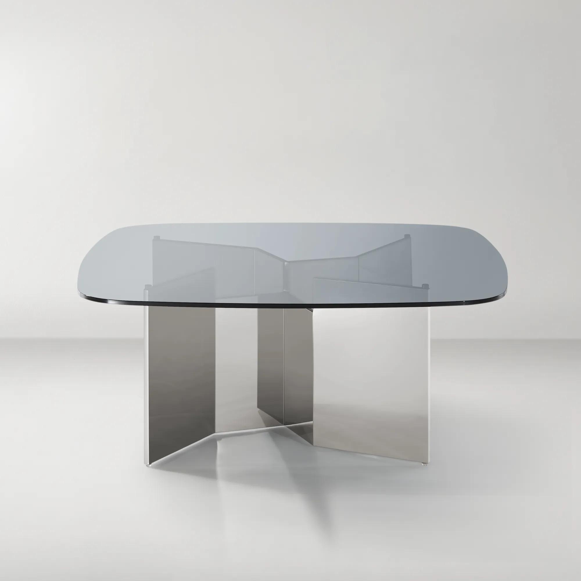 The Reflective Coffee Table is a show-stopping blend of light and texture. Crafted from 12mm tempered glass with a semi-transparent charcoal finish, its polished stainless steel base adds modern sophistication. Whether you’re entertaining or enjoying quiet moments, this table is both functional and striking—a true conversation starter.DETAILS AND DIMENSIONSAngle shapped stainless steel base in polished finish gives the table a modern update12mmT charcoal tempered glass top with rounded corner for safer using experienceDurable fixed base with removable top, easy to move12mmT tempered glassPolished stainless steel baseCharcoal top, silver baseSemitransparent glass topFrame Material: Stainless steel43.31" x 43.31" x 17.72" Sold separatelyImportedOTHER INFOFor indoor use onlyWipe clean with a soft, dry clothKeep dryTo prevent oxygenization, please don't place this product in high moisture space or wet floorEasy assembly within 1 minute