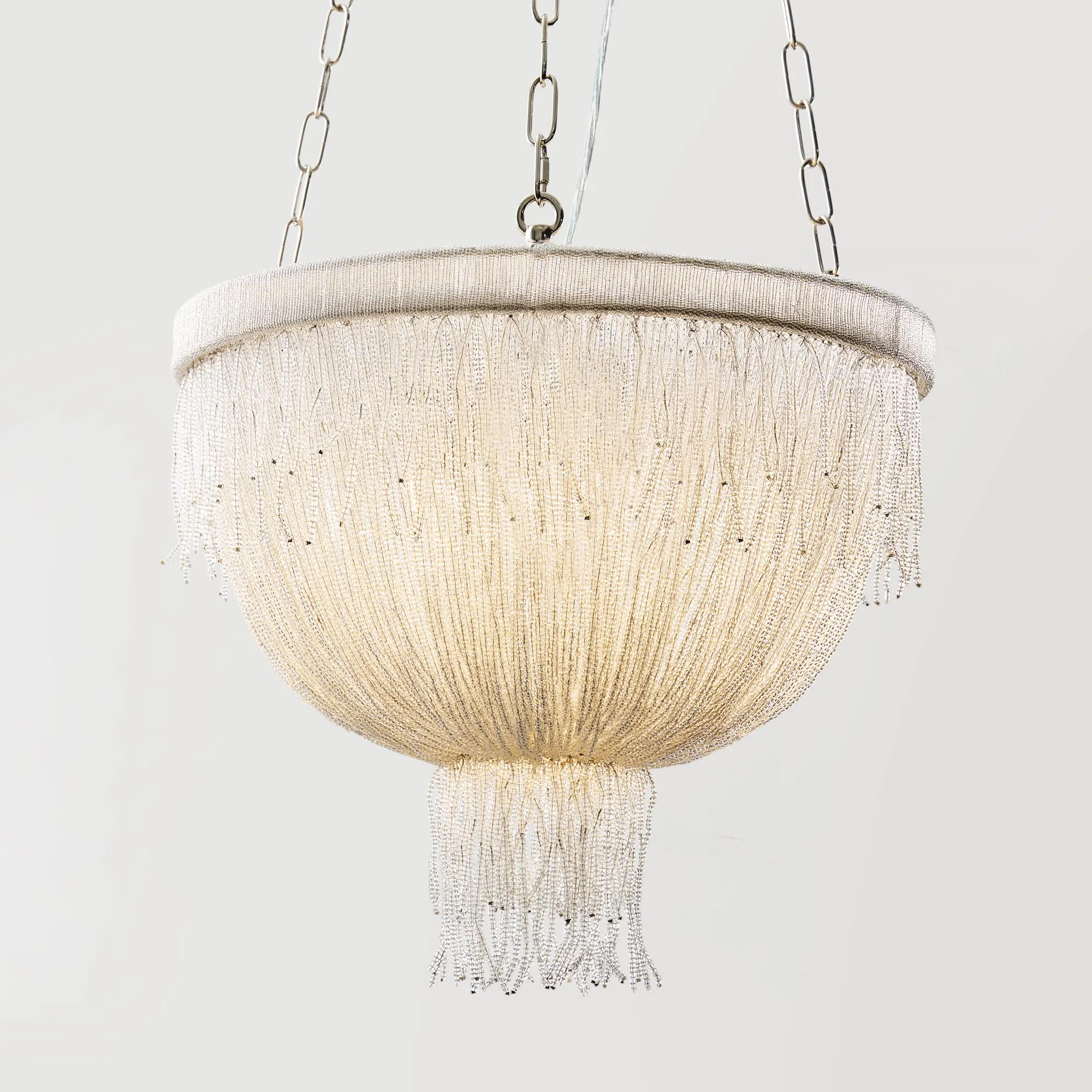Cascading glass beads create ethereal beauty in our Selene Chandelier. Clear glass catches light brilliantly against the nickel frame, while seven lights provide perfect illumination through the 20-inch diameter design.Z Gallerie ExclusiveDETAILS AND DIMENSIONSFixture dimensions: 20"DIron frame in nickel finishClear glass beadsLink chain length: 71", adjustable length with quick link includedClear cord length: 78"Ceiling Plate: 6"DE12 Socket x 7Type B candelabra bulb, 40W max each (bulbs not included)Slope ceiling compatibleDimmer switch compatible If the dimmer wattage is larger than 420WUL listedHanging weight: 24.2 lbsOTHER INFOWipe clean using a soft cloth.Avoid using harsh chemicals and abrasives as they may damage finish.